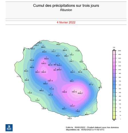 Tandis que la côte sous le vent (côte Ouest) est, la plupart du temps, protégée des vents et des pluies durant les cyclones, les sommets ont enregistré des vents à plus de 200km/h et des pluies correspondant à quatre ans de pluviométrie à Paris en trois jours de temps