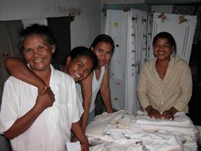 L’artisanat est très riche et nous profitons toujours de nos voyages pour en ramener le maximum car lors de nos manifestations, nous en vendons afin de pouvoir continuer notre oeuvre : lamb (=paréo), étuis pour vanille avec vanille, serviettes de toilette en nid d’abeille brodées (voir photo de la mère et de ses trois filles), beaucoup d’objets en marquetterie, soubik, dessous de plat en raphia, pochettes en raphia. Cette année, notre amie a été arrêtée à la douane à Tananarive pour savoir si elle ne faisait pas de l’importation…