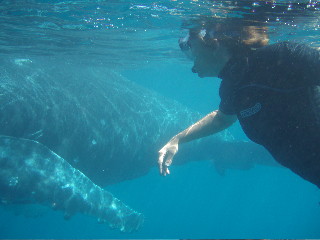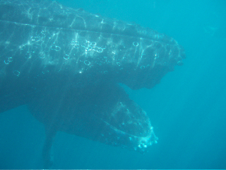 Puis, après une bonne heure passée avec nos amis les dauphins, nous voici repartis à la recherche des baleines. Il ne nous aura pas fallu plus d’une heure pour rejoindre une baleine et son baleineau (renseignés par nos amis les plongeurs en bouteille). Cette fois-ci, le baleineau était en récréation, et il s’en donnait à coeur joie, en sautant dans tous les sens. Nous évoluions à une trentaine de mètres de lui. Magique. Eric s’est même mis à l’eau et a pu voir la mère, énorme !