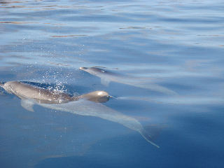 Mais le top du top, c’est quand on a la chance d’être sur l’eau, avec elles. C’est ce que nous avons vécu à plusieurs reprises la semaine dernière. Il y a 10 jours, nous avions loué un bateau pour aller à la rencontre des dauphins et des baleines. Nous commençons par la baie de St Paul, où comme d’habitude, plusieurs bancs de dauphins évoluaient. Nous nous mettons donc à l’eau en PMT (Palmes Masque Tuba) et nageons avec ces mammifères qui s’amusent avec nous. Que du bonheur !!!