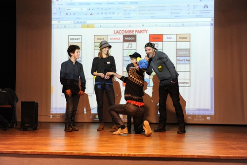 Après le diner « soirée de gala » animée par les « Delarue Brothers ». Impossible en les voyant sur scène de ne pas penser à l’ineffable duo des Blues Brothers. Ils ne sont pas tout de noir vêtu mais portent un couvre chef et des lunettes noires et possèdent la même agilité. Complices, drôles, imaginatifs, entraînants, hommes de scène, animateurs d’un jeu complètement fou « Lacombe Party ». Sorte de jeu de l’oie qui se joue en équipe et dont les règles ne peuvent qu’engendrer, rires, cris, mauvaise foi, réclamations et au final un grand moment de joie collective.