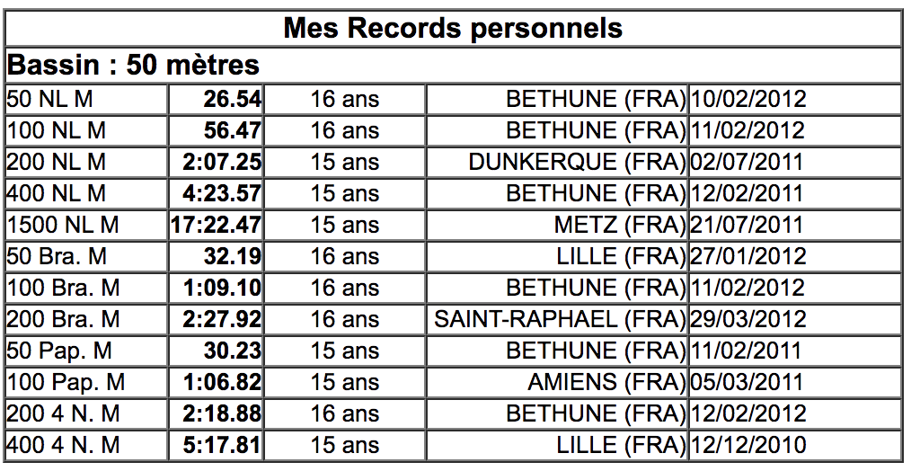 L’année dernière j’ai participé aux championnats de France de natation Minimes, j’y ai nagé le 1500 mètre nage libre, le 100m et 200m brasse, j’ai fais une finale C au 100m brasse avec le 14éme temps de la compétition.